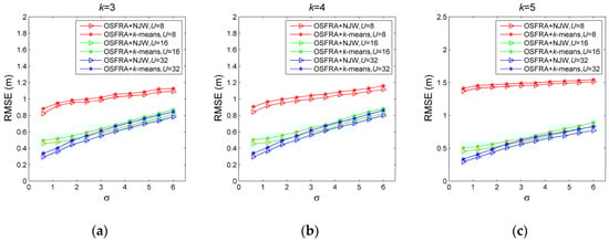 The localization accuracy of OSFRA+NJW and OSFRA+k-means are compared in this subsection to investigate the effectiveness of the NJW-based algorithm. As shown in Figure 9, for each set of , U, and k, the RMSE of OSFRA+NJW is always lower than that of OSFRA+k-means. Take = 1.2, U = 32, and k = 5 for instance, the RMSE of OSFRA+ NJW is 0.3674 m, while the corresponding value of OSFRA+k-means is 0.4101 m. In addition, the relative improvement of OSFRA+NJW referring to OSFRA+k-means, given by , is listed in Table 1, revealing the superiority of OSFRA+NJW in a more visible way. Compared with the cases with large , the relative improvement in the cases with small are more remarkable. Especially when U = 32 and , the superiority exceeds 10%. As increases, the superiority decreases gradually but always exists. Even for the cases with = 6, the average relative improvement reaches 5.93%. Such behavior demonstrates the stability of OSFRA+NJW.
