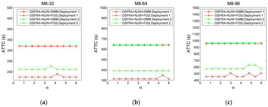 The average total time consumption (ATTC) comparison for OSFRA+NJW+DMM and OSFRA+NJW+FGS under various , mapping instances and tracking tag deployments. (a) M8-32. (b) M8-64. (c) M8-96.