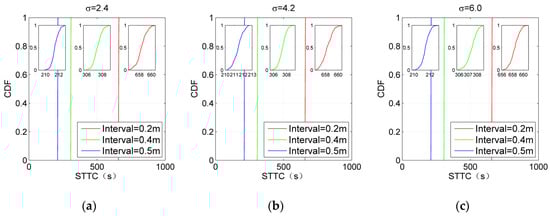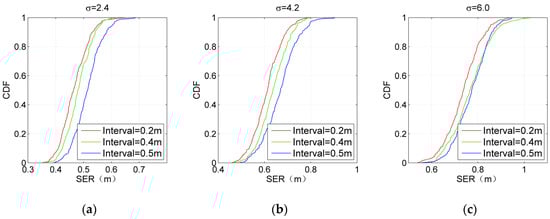 For comprehensively evaluating the performance of IKULDAS, the interval between two adjacent reference tags is adjusted to be 0.2, 0.4, and 0.5, respectively. D1 and M8-32 are chosen as the scenario conditions. The number of clusters for NJW is set to four. Figure 12; Figure 13 depict the accuracy and efficiency in the form of the cumulative distribution function (CDF). In the case of Figure 12a, it can be seen that the 50th percentile of SER with 0.2, 0.4, and 0.5 interval are below 0.52 m, while the improvement from the 0.4 interval to the 0.2 interval is weaker than those from the 0.5 interval to the 0.4 interval. Such a gap in the improvement illustrates that the improvement resulting from tag density would reach an upper bound as long as the interval arrives at a critical value. Note that the feature of such a gap changes as increases. As shown in Figure 12c, the improvement from the 0.5 interval to the 0.4 interval blurs due to the large deviation of RSSI caused by larger , while the improvement from the 0.4 interval to the 0.2 interval is still clear. It can be concluded that a larger density of reference tags is essential for the accuracy in the high-noise cases. As for Figure 13, it can be seen that the decrease in the interval would aggravate the time consumption. Clearly, an appropriate interval can be obtained by carefully balancing the context requirement of the accuracy and time consumption.