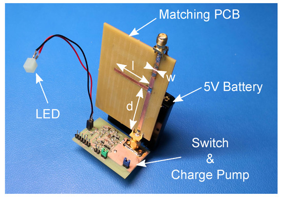 All circuits of the proposed prototype, including LS, CP and matching network, are fabricated on ‘Panasonic R-1566 FR4 Laminate’ [25]. The device under test (DUT) for all performed measurements is shown in Figure 4. A LED was used as load, driven by a battery.