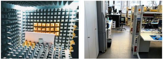 The second measurement setup M2 also takes the air interface between DSG and DUT into account. This setup was used to perform two different measurements. First, the relationship between the distance and the received power was investigated in an anechoic chamber (see Figure 7—left). In the second step, the maximum range of the system was determined in a realistic environment akin to the situation in a consumers living room, with plenty of possibilities for multipath propagation (see Figure 7—right).