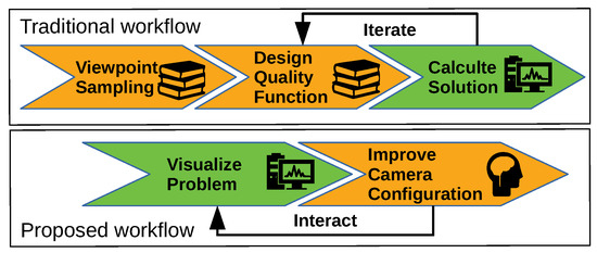 Figure 2. Our proposed workflow avoids the need to perform a challenging viewpoint discretization step and the step that designs a specific quality function. These steps both require intimate knowledge about both the practical problem and theory of camera design planning. The advantage of the traditional workflow is that a computer can automatically solve the camera network design problem. But in reality these results often do not correspond to what is expected by the user. This is mainly because the quality function is not aligned with the intuitive expectation of the user. Another common problem is that many informal notions of quality cannot be directly encoded in the cost function.