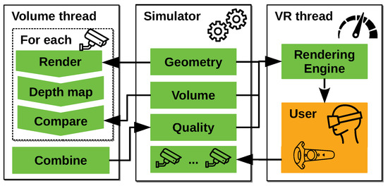 Figure 3. In this section, we will give a brief overview of their function but each will get a more detailed treatment in a later section. The first part is a simulator that handles all geometries, maintains its positions and performs dynamics calculations. The second part is responsible for calculating the coverage and quality for a given camera system. The final part is responsible for rendering to the virtual reality device and managing user interaction.