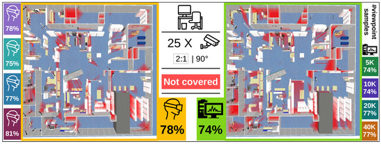 To obtain a set of viewpoints for the automated algorithm we uniformly and randomly sample 40 k points over the entire office at ceiling level. For each position we generate a random orientation that does not point upward. This discretization was the result of an active search for the best possible discretization achieving the highest coverage. All evaluations of coverage are relative to a dense sampling of the environment of 4.8 million samples (resolution of 0.1 m).