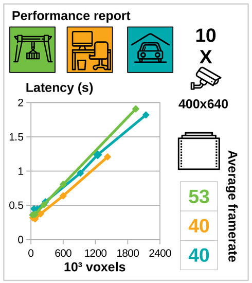 Figure 8. These results are obtained by positioning 10 cameras of a resolution of 400 by 640 pixels in each scene. Average framerates for all scenes are over 40 FPS. We further noticed that the average framerate was independent of the number of voxels. The effect of the number of voxels on the latency is linear as expected, and remains linear up to a high number of voxels (2 million). We also increased the number of cameras up to 30 cameras and noticed the same linear trend. In the interest of saving space we therefore omitted this result from this work.