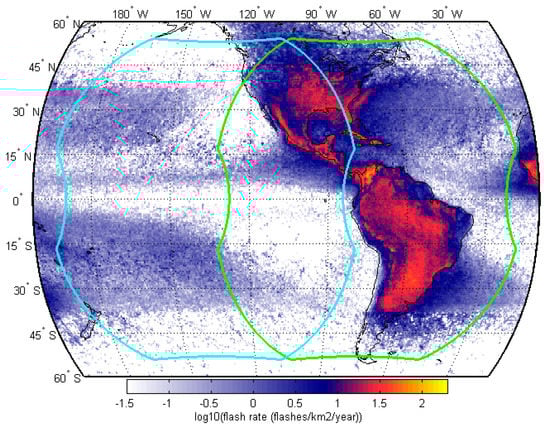 GLM provides continuous coverage from geostationary orbit and covers approximately half of the Earth with the Americas as the primary land-mass focus. Its spatial resolution is in the range of 8–14 km. Currently, two GLM sensors are in space: GOES 16 occupies the geostationary orbital slot at 75.2 degree west and GOES 17 is located at 137.2 degree west. Figure 2 shows the geographical coverage for both GLM sensors over a map of lightning intensity. Parts of the United States and the Pacific have overlapping fields of view of the two GLM sensors potentially enabling stereo bolide detections.