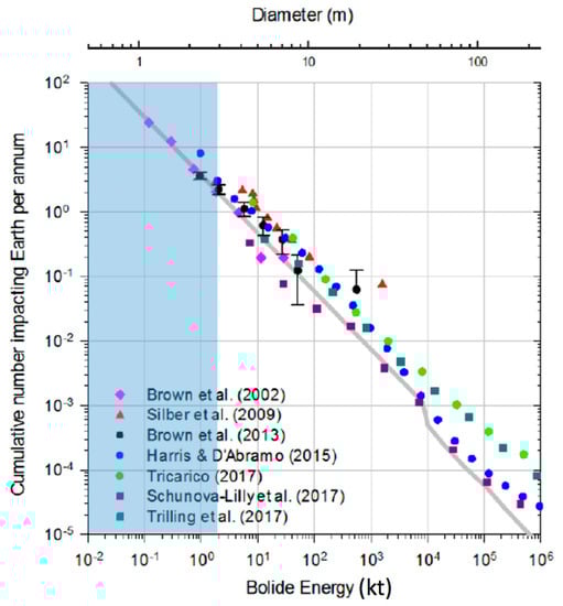 Figure 3 presents size and impact frequency for bolides. It is estimated that a 1 m diameter small asteroid collides with the Earth every two weeks, while a 4 m diameter object hits the Earth roughly once per year []. The shaded blue area in Figure 3 approximates the usable bolide detection regime expected of GLM. It extends from 0.1 m (outside the figure) to 3 m. The axis conversion of impact energy and object diameter fits the assumption of a meteoroid density of 2300 kg m−3, and an impact speed of 21 km s−1. The data points in the figure correspond to other sensor systems such as CTBTO and space based USG sensors. The expected GLM detection regime complements the detection range provided by these remote sensing systems towards smaller sized meteors.