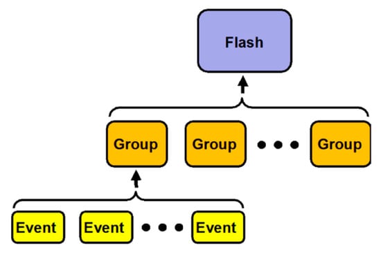 There are three data structures in the GLM level 2 relevant to this document. They are events, groups and flashes. Although conceived for applications in a lightning context, these data structures are not lightning specific and can be understood as a general GLM data concept. An event represents a light emission signal that stood out against the background image seen by the GLM sensor. An event occurs in an individual pixel over a 2 ms integration period. A group represents the collection of events detected in adjacent sensor pixels over the 2 ms integration period. A group’s energy is equal to the sum of its event’s energies and the location of a group is the energy weighted average location of its events. A flash represents a series of measurements constrained by temporal and spatial extent thresholds that are associated with one or more groups. In a hierarchical sense, a flash is at the top, followed by a group, with events representing the smallest entity as visualized in Figure 4. The algorithm presented here mainly utilizes the group structure.
