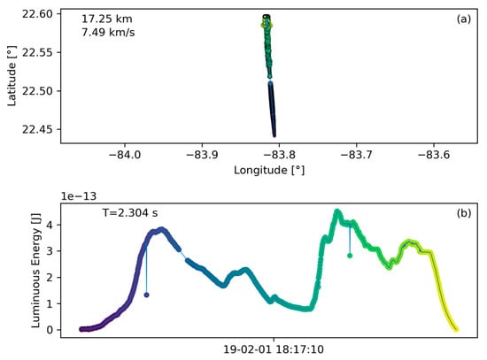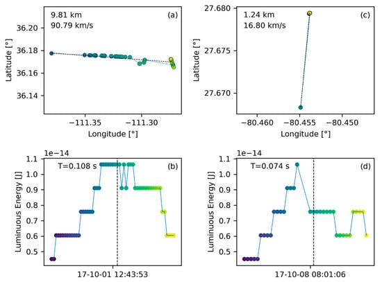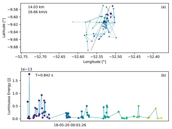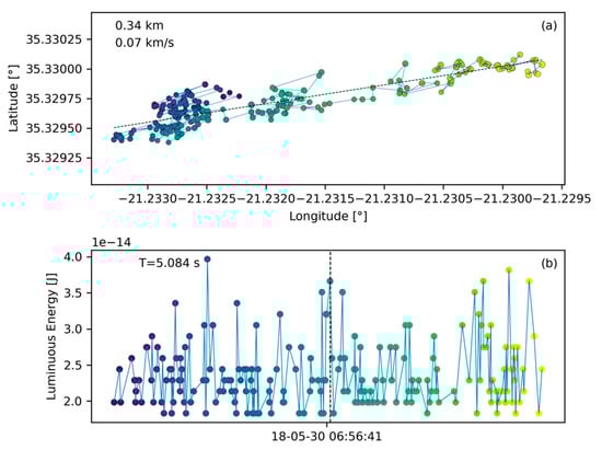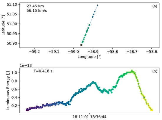 The most common data entity found in the GLM L2 data are lightning flashes as shown in Figure 5. This figure presents the ground track of the flash in plot (a) on a latitude/longitude coordinate grid (in degrees). Each ground track point is a group location as assigned in the GLM L2 data product. The distance between the two furthest ground track points is annotated in the top left corner conveying a sense of scale. Below the distance, speed is annotated which is calculated as the division of the ground track extent by the signature duration. Note that the ground track only shows the horizontal component of the trajectory (more relevant for meteors), equivalent to a projection of the trajectory onto the ground. Speed estimates are therefefore only indicative and may differ significantly from the true speed. For illustration, consider a meteor that enters on a near vertical trajectory in which case the ground track extent will be small and the speed estimate is low. Hence, the speed tag only shows the horizontal component of the meteor velocity. The signature duration is noted in the top left of plot (b). Plot (b) presents the light curve in terms of received luminous energy at the aperture of the GLM in Joules over time. This is not the total energy emitted by the bolide and further scaling is necessary for such an estimate [,,,]. For formatting reasons only the date and time stamp corresponding to the signature’s middle group is shown. Together with the signature duration, these coordinates provide adequate information about the flash occurrence time and its persistence.