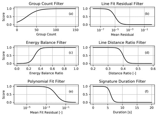 Filter functions providing the passing score in the range [0,1] for each test. A larger score is returned when: Plot (a)—more groups constitute a flash; Plot (b)—the line fit returns a low residual; Plot (c)—the flash energy balance is skewed to later times; Plot (d)—the maximum observed distance between any group and the fitted line is small; Plot (e)—the polynomial fits return smaller residuals; Plot (f)—the signature’s temporal duration is shorter.