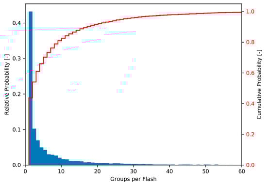 The smallest measurement entity that is utilized by the algorithm in Level 2 data is the GLM group (Section 2.1). With this basis, the algorithm searches the data sequentially for other groups that are spatially and temporally close (Table 1) and collects those into flashes which then can become bolide candidates after passing the filters. The first filter for a bolide flash to pass in order to be considered a bolide candidate is the minimum number of groups that constitute a bolide flash. Individual light emissions in typical lightning storms, are short and distinct, triggering only a limited number of group recordings, resulting in a low group count (compare number of data points in Figure 5b with Figure 6b). Conversely, bolides emit light continuously and over longer periods than a number of light emissions in a lightning storm. It is expected that bolide flashes in GLM data distinguish themselves from lightning data by a larger group count per flash. To support this observation, the histogram in Figure 8 shows the distribution of group count per flash based on three minutes and twenty seconds worth of randomly selected data. Only 9% of the recorded flashes have more than 20 groups. For comparison, the bolide portrayed in Figure 6 corresponds to a flash with 519 groups. In fact, flashes with large group counts are outliers and represent an effective filtering opportunity for bolides. It is therefore prudent to filter out flashes with a small number of groups as those are likely lightning and to pass those with large group counts. Here, the b-parameter of the group count filter was set to . Based on extensive algorithm sensitivity analysis baseline filter parameters were chosen and they are listed in Table 2.