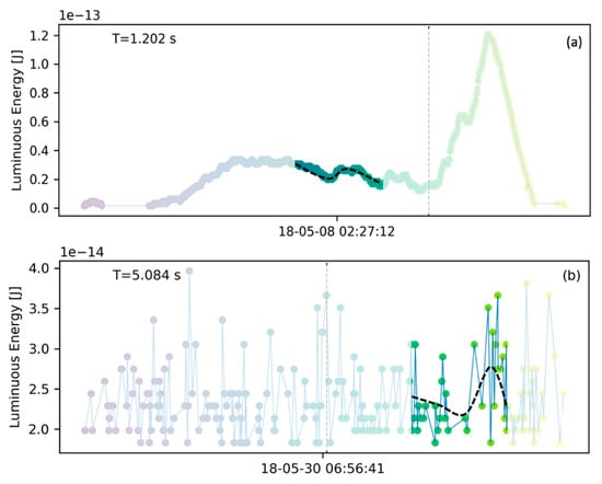 A polynomial is notionally fitted to the highlighted subrange of the light curve data as a dashed black line. It is clear that in the case of the bolide (Figure 10a), the polynomial yields a closer fit than a similar fit to the lightning lightcurve (Figure 10b). The metric of the fit is the least-squares residual for the polynomial normalized by the energy range of the signature. Thus, the normalized polynomial residual is the sum of squared residuals for the current subrange of the lightcurve divided by the squared energy range of the signature as shown in Equation (5). The residual normalization with the energy range is necessary because flashes with large energy releases (such as bolides) would otherwise yield large residuals even though the fit appears adequate: