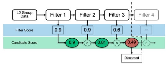 Algorithm architecture. The L2 group data passes through each filter sequentially and the product of the individual filter scores forms the cumulative candidate score. If the cumulative candidate score falls below the threshold value (here 0.5), the signature is discarded.