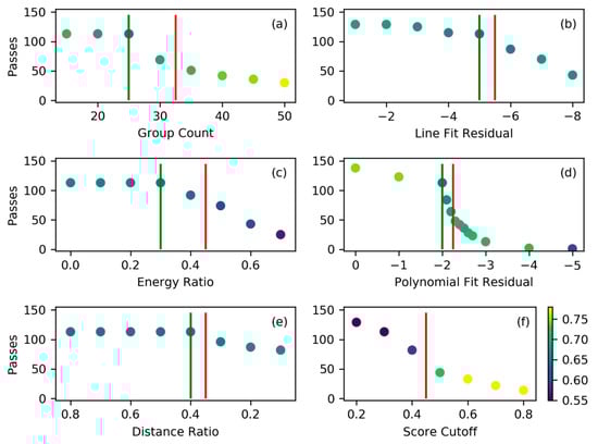 Filter effect on number of bolide candidate passes. The plots are oriented such that the filter parameters further to the right correspond to a more restrictive filter setting. The green line indicates the baseline filter setting. The red line marks the filter parameter step when a known true positive bolide signature was filtered out from the evaluation subset corresponding to an overly restrictive filter setting. The color shading of the points corresponds to the mean bolide score in the passed instances (colorbar shows score values). The shown filters are group count (a), line fit (b), energy ratio (c), polynomial fit (d), distance ratio (e), and cumulative bolide score cutoff (f).