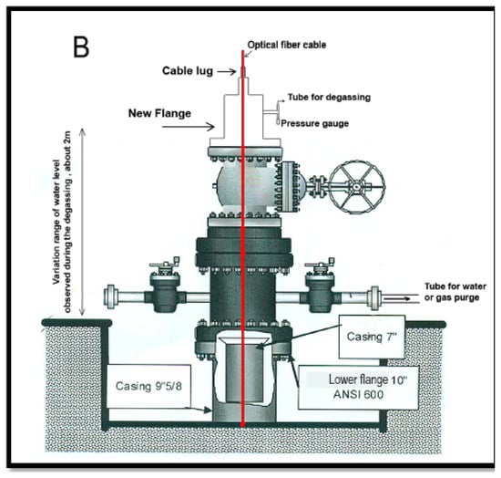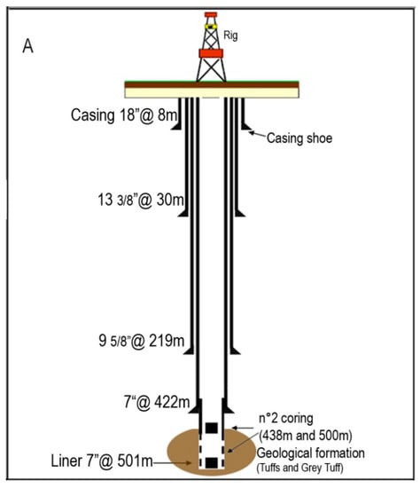 The Bagnoli1 Well, pilot hole of the Campi Flegrei Deep Drilling Project (CFDDP) has been drilled from July to December 2012. The well has been co-funded by INGV, ICDP (international Continental Drilling Program) and the EU-GEISER Project. Drilling has been realized in two parts, using two different Rigs. The first rig, used to drill 0–222 m (since July 15th to July 30th) was a Massenza MI60 equipped with blow out preventers. Then, the drilling was stopped until November 21st, when it started again with a new, more powerful rig: a Corsair 300 with a rotary table. The drilling reached 501 m of depth on December 2nd, then it was stopped there. Casing shoes were located at depths of 8, 30, 219 and 422 m of depth. A slotted liner completed the well down to the maximum depth, leaving an open hole section in the depth range 422–501. On December 3rd, a Leak Off Test was performed to measure the size of the minimum tectonic stress and the permeability, at the bottom open hole section [3,19]. Figure 4 shows the drilling diagram. Well after drilling (in April 2014) the fiber optics sensor has been inserted into the well. The installed cable, as shown in Figure 3, featured a stainless steel loose tube for optical fiber protection, stainless strength members and TPE outer sheet. The overall diameter of the installed cable was 3.8 mm, while its maximum tensile strength was 1500 N. The well design and the scheme and photo of the well head are shown in Figure 5.