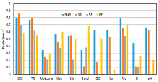 Multiple calibration modeling methods (i.e., PLSR, NF, RT, and RF) were compared for the estimation of soil properties. The PLSR method was either the most accurate or the second most accurate method for each of the soil properties (Figure 2). The average R2 values across all soil properties for PLSR, NN, RT, and RF were 0.59, 0.46, 0.39, and 0.45, respectively. When looking at individual soil properties, PLSR results were best for six of 11 (soil moisture, CEC, Ca, Mg, K, and pH). Neural network results were best for SOC, TN, and silt, while RF performed the best for clay and sand. The lowest R2 values were consistently produced by the RT method, with some RT analyses not converging to a solution. In addition to the six soil properties where it gave the best results, PLSR was the second-best performing for four other properties (SOC, TN, clay, and silt) where R2 with PLSR was within 10% of the best method. Therefore, PLSR was selected as the most robust calibration method with DECS, and was used for subsequent analysis.