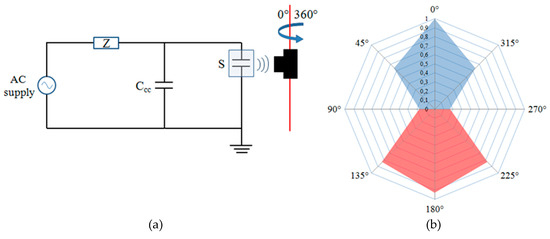 At first, a sample emulating corona discharges has been used, with classic configuration needle-plane and 5–10 mm air gap, and the sensor has been positioned at 15 cm from the PD source. In order to evaluate the antenna response, according to the rotation angle with respect to the source, the PD pulses have been acquired by rotating the Pry-CamTM horizontally from 0°–360°, as shown in Figure 6a. The acquired PD amplitudes have been scaled with respect the maximum amplitude of the 0° phase angle, and the amplitude response diagram is reported in Figure 6b.