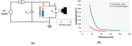 Measurements with the corona emulator and calibrator at different distances from the discharge source: (a) Measurement circuit; (b) results.