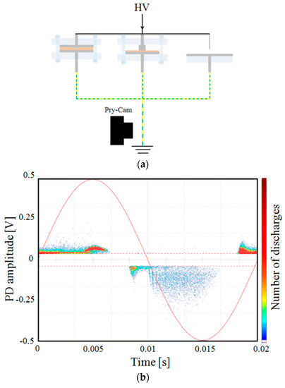 In order to recognize and separate different PD sources, an experimental test has been performed, and results are reported. In particular, the three specimens of Figure 9 have been parallel connected and powered at a high voltage. The three specimens’ connection is reported in Figure 15a, and the PD pattern provided by the sensor in this configuration is reported in Figure 15b.