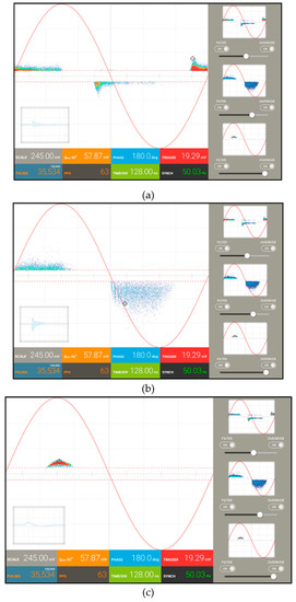 In order to choose different PD phenomena, filters are applied by selecting a single PD pulse from the pattern with the index finger and then moving the selected pulse to the right side of the screen, where up to three filters can be applied simultaneously. For each of them, there are three cursors that the operator can choose; the filtering intensity by varying the cross-correlation level, the pattern visualization between the selected signal and remaining signals, and finally, the filter off switch. The applied filters can work in real time or after measuring (post-processing mode). In Figure 16a, the surface and corona pulses have been filtered, and therefore only the internal discharges are visible in the PD pattern. In Figure 16b,c, only the surface and corona discharges are present, respectively, while the other PD pulses have been filtered.