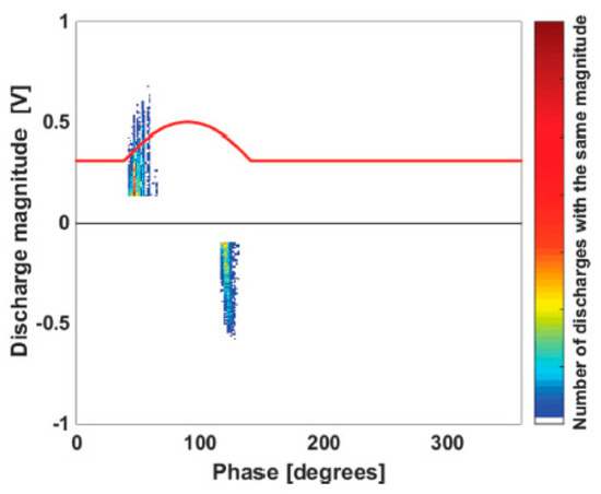 The antenna sensor was also used to detect PDs signals in an experimental test in which a specimen was stressed with a continuous periodic DC waveform [23]. This new type of waveform has been developed with the aim to overcome some PD measurements issues under DC stress. It has been derived from a single-phase half-wave rectifier and follows a sinusoidal law for a certain period while it is constant in the remainder part. The sinusoidal part of the waveform allowed both the triggering of the PDs and the PD probe synchronization with 50 Hz. As part of the advantages provided by the proposed new waveform for the PD measurement, it is important to highlight that the antenna sensor results are able to detect the PD pulses and provide a satisfactory PD pattern. For a specimen containing an air void defect, the acquired PD pattern is reported in Figure 18, in which the red line represents the continuous periodic DC waveform used as the voltage stress.