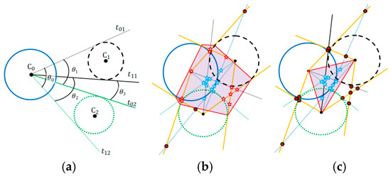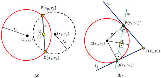 - The line equation that passes through point and is perpendicular to the line is defined asCircle—In the Cartesian plane the equation defines the implicit circle equation centered at the point with radius . Let be an external point to a circle. By using we can obtain two tangent lines, and , to the circle (Figure 1b), which pass through points and , respectively. Points and can be computed by applying the geometric concept of pole-polar definition.Pole-Polar Geometry—Pole-point and polar-line are, respectively, a point and a line that have a unique reciprocal relationship with respect to a given conic section. If the point lies on the conic section, its polar-line is the tangent line to the conic section at that point [24]. If the pole-point is external to the conic section, the polar-line intercepts the conic section exactly at the points that allow passing tangent lines from this pole-point (Figure 1b). Our interest is to pass two tangent lines, and , through a circle centered at point with radius . Moreover, these lines must pass through a known external point (or pole-point) to this circle (Figure 1b). We need to locate the coordinates of the polar-points and , which define the polar-line and lies to the tangents lines and . Additionally we must find the equation of the polar-line .