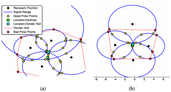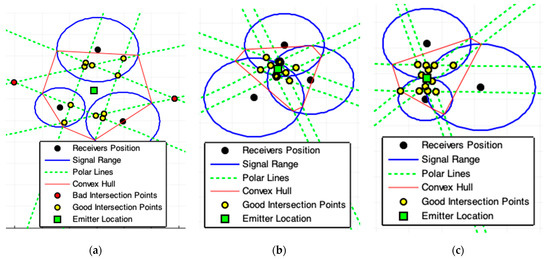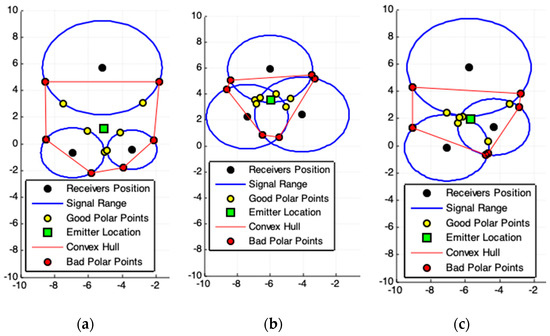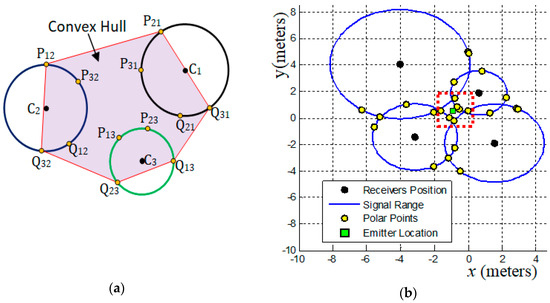 - The convex hull algorithm is used in this work to specify a Region of Interest (ROI).To illustrate the use of the convex hull we must consider the existence of three receivers centered at coordinates (and these coordinates cannot all be collinear) that collect a signal from a point with distance and (radial distance), respectively. and , , represents the polar-points that lie to the circle centered in that is obtained by the external point (center of another circle), as Figure 2a shows. Thus, the smallest convex polygon that contains all obtained polar-points is the convex hull for these points and this minimal polygon defines our ROI. This region in red-color lines is used to illustrate the ROI for the proposed geometric models presented below (always representing a convex hull to define a ROI).