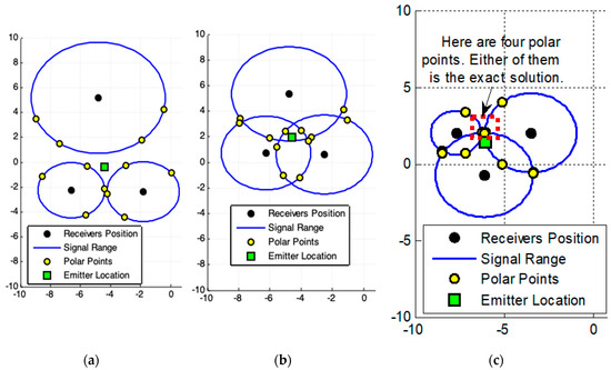 The Equation (8) is a nonlinear equations system to solve the emitter location . If , this equations system is normal and can be solved either by a numerical or empirical method or applying the analytical solution showed in Figure 1a. If , the system is redundant and allows minimizing the solution error by means of Nonlinear Least-Squares (NLLS).