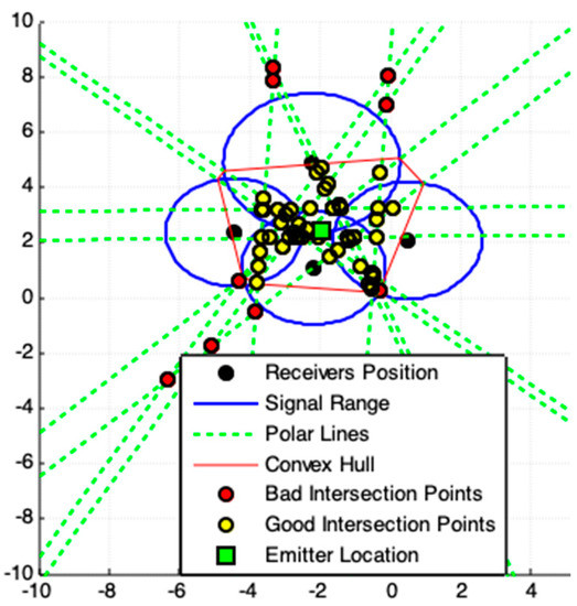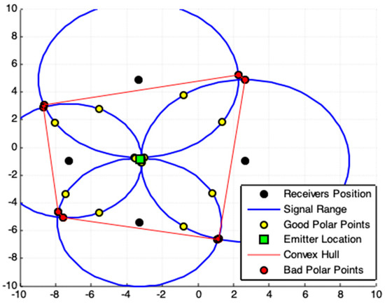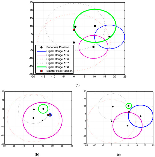 Thus, we know the position of each emitter given by ; the radial signal-range at each AP given by and; the real receiver position given by (Figure 15).
