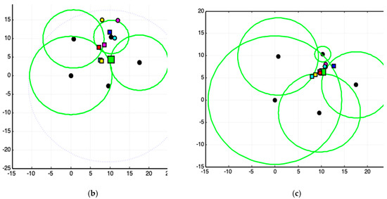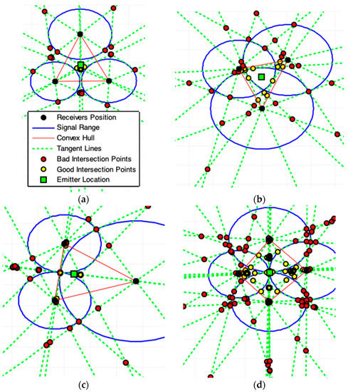 The worst case, Figure 17a, deals with the case of inconsistency of acquired data. Even, if the use of such data does not show the precise location of the emitter, the results produced by the geometric models are consistent with the geometric arrangement among data. The solution is found on the region where most of signals range (circles) intersects. The solution is inaccurate because of the serious deviations in the acquired data. If data inconsistency is moderate (Figure 17b), the proposed geometric models generate higher quality results than those produced by numerical methods.