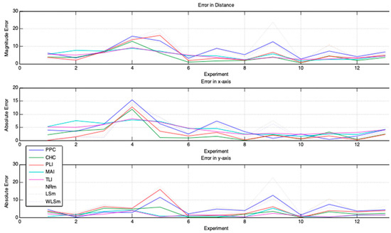 For accomplishing the analyses, twelve experimental cases are generated (Figure 14) and the proposed geometric models (PPC, CHC, PLI, TLI, and MAI) are utilized in each acquired data set. We also use WLSm, NRm, and LSm methods to demonstrate the superior quality of the proposed geometric models. The metrics of analyses (distance error, x-axis error, and y-axis error) are computed for each result obtained from the geometric models and numerical methods. Figure 16 shows the magnitude of these errors for each experimental case. In these graphs, the 13th case represents the arithmetic mean of the magnitude errors for the respective metric and model/method.