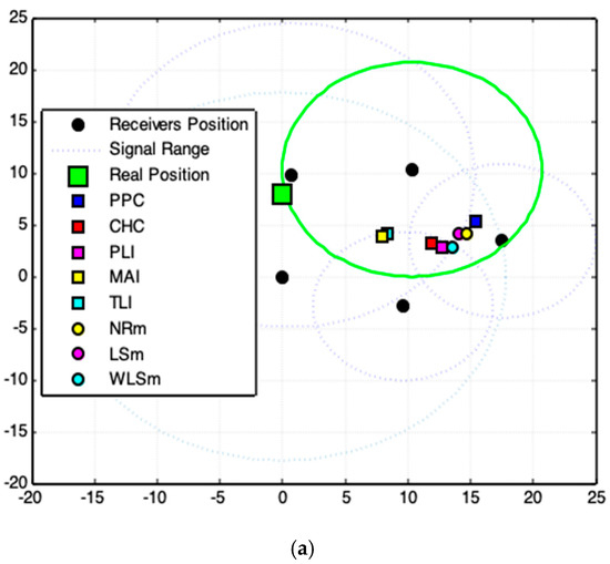 Figure 17c shows that when satisfactory data make all methods and models works with relative precision, whereas data incoherencies (dotted circle lines in Figure 17) make results divert of the expected solution, and Figure 17a–c confirms that the proposed geometric models point to a location closer to the exact position of the signal source than the numerical methods used and can better solve the existing problem of data inaccuracy.