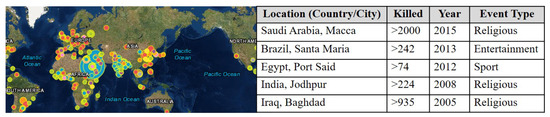 Due to the unprecedented scale and speed of urbanization, cities are facing the daunting task of accommodating the urban dynamics. The concept of smart cities attracts city planners and researchers as it facilitates many smart community services by combining cyber-physical systems and social entities through the wireless, mobile, and intelligent information and communication technologies (ICT). One of the critical service requirements of future cities is the safety management for citizens and communities [1]. Specifically, the safety management during the densely populated events such as religious, entertainment (such as sport and music), and political gatherings becomes more significant as it happens more frequently and in large scales in modern cities. Unlike static crowd events where a crowd is formed in a specific location, or when a crowd is moving from a location to another (i.e., unidirectional), it requires more space (i.e., less density). If crowd mobility exhibits multiple non-unidirectional patterns, it would require even more space to be safe and is much harder to manage or control [2,3] them. Risks of human casualties at mobile crowd events are more likely to occur because small incidents at the crowd are enough to cause panic to the attendees to start hustling, collapsing, trampling, and stampeding each other. Any inappropriate crowd management often results in disastrous repercussions such as injuries and casualties [4]. Figure 1 shows many recent cases of crowd disasters that cause human losses around the world. The community stakeholders need to provide their best efforts to maintain the crowds properly.