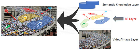 The recent smart video surveillance inspired by the advanced artificial intelligence (AI) technologies and machine learning (ML) algorithms enables a broad spectrum of promising safety applications, including object detection and identification, behavior recognition and tracking, and anomalous event detection [6,7]. However, video surveillance alone cannot identify and predict particular crowd status. It cannot scale and lacks the capacity for providing an appropriate mobile crowd safety management in real-time. For example, in Mecca, Saudi Arabia, during Hajj season, groups of pilgrims were taking the opposite road direction to get to their destination faster. When the crowd flow got clogged from the crowd flow from the opposite direction, it resulted in more than 2000 casualties. Although there were 5000 video surveillance points installed all around Mecca to monitor the Hajj season [1], the accident was not able to be prevented in time. The image layer in Figure 2 shows a very high-density crowd that is located on a bridge. However, it does not reveal the group identity and location within the crowd and their moving direction and speed.