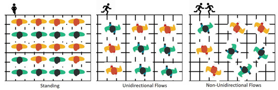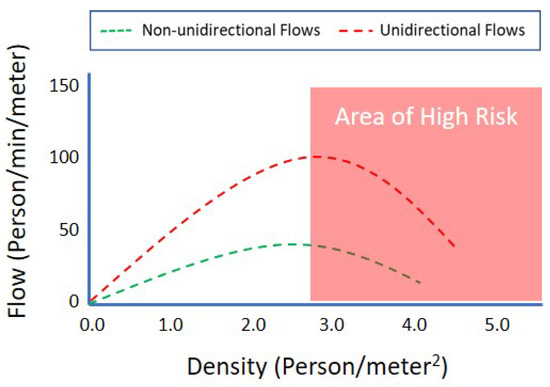 According to the crowd safety and risk analysis [29], understanding the impact of crowd density (the number of people per square meter) for both a standing crowd and a mobile crowd is critical for managing crowd safety. For example, to assess the efficiency of crowd movement, a capacity of places, it needs to understand the relative risks of both standing crowd density and the moving crowd density. In some case, if a standing crowd becomes mobile and a unidirectional crowd becomes non-unidirectional, the planned capacity design fail. It can cause any unexpected disasters. Figure 3 illustrates the standing, unidirectional, and non-unidirectional density in people per square meter. At low densities (i.e., one person per square meter), the mobile crowd is free-flowing and stable, and the standing crowd is safe and comfortable. As illustrated in Figure 4, when the crowd density (the number of people per square meter) increases, the comfort level of the crowd decreases and flow speed starts to decrease as people cannot take full paces forward. After a saturation point, crowd mobility becomes constrained and accumulated, and the flow rates dramatically drop. For the crowd moving in the same direction, when density becomes more than three people per square meter, the flow speed starts to decrease, and when density becomes more than four people per square meter, the flow speed drops to become a high-risk crowd. However, when the crowd moves randomly in different directions, the flow speed decreases significantly, and the lower density and even at a density of 3 or 2.5 people becomes a high-risk crowd. In a low-density case, a collision can be avoided by stopping the flows. However, in a high-density case, when crowd force pushes people in the front forward, shock waves began to ripple through the tightly packed mass, and it causes a crush and crowd disasters. The crowd safety management should be able to predict the potential flow directions well before the crowd is getting into a high-crowd condition.