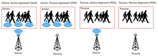 In a wireless communication system, there are a couple of common messaging modes. In a passive mode, a node does not send any periodic message but scans incoming messages. In an active mode, a node periodically sends messages to indicate its existence. As illustrated in Figure 6, the combination of these two modes are used between the BLE scanners and the pedestrians’ bracelets (BLE trackers) to communicate the crowd states. A tuple of the BLE tracker mode and the BLE scanner mode approaches including an active-active approach (AAA), an active-passive approach (APA), a passive-active approach (PAA), and a passive-passive approach (PPA) were investigated to ensure efficiency in power usage, increase the scalability in message communications, and improve the accuracy in event detection.