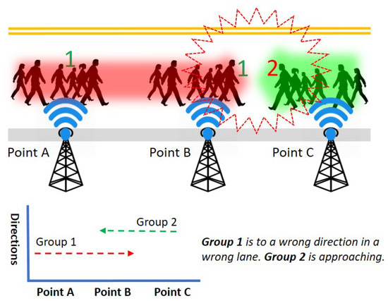 Group speed and direction detection: Even if the crowd is moving in the same direction, the moving speed can be different from one group to another. It may cause congestion and collision by the fast-moving groups. For example, Figure 7 illustrates the scenario where a couple of groups are walking in the same direction. However, a fast-moving group 1 in the back causes congestion by taking up the front group 2. ICE-MoCha can detect the moving speed of each group from the time-stamp and the distance from BLE scanners at point A to B. If the speed of each group can be detected earlier, the system could predict any potential collision. Assuming the average walking speed of a human is 3.1 mph (5 kph) [8], ICE-MoCha can identify the speed of each group and gives a warning to the fast-moving groups or members. Furthermore, if group 2 is moving slower than the average speed, the system can alert group 2 to speed up or give a slow down warning to group 1. The BLE scanners also coordinate to detect the movement direction of each group. By comparing the time-stamps of each groups’ passing position, ICE-MoCha can also detect the moving directions of each group. For example, Figure 8 illustrates that a group 2 is moving from the BLE scanner point A to point B. However, assuming that group 1 is supposed to move in an opposite direction according to the schedule, ICE-MoCha can identify a potential wrong direction of group 1 (or a temporary backward movement). The wrong movement shall be alerted to the group and other neighbor group as it may result in a collision with upcoming group 2.