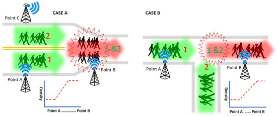 Group density detection: ICE-MoCha can scan the density of each group within the monitoring range and shares the information with the neighbor scanners in real-time. In practice, a crowd collision (i.e., unexpected high density) often happens for various reasons. It can be due to the structure of the road as well as human errors. For example, as illustrated in Figure 9, two lanes are merged into one lane and various intersections mix flows into several directions. Also, shown in Figure 10, a group of people in a crowd may be veering off an opposite lane (when it is available) instead of using the slow and crowded path so that they can move faster. These cases can be identified by tracking the density changes on each point. Both Case A and Case B illustrate scenarios where groups 1 and 2 are merging into one lane due to the road design either merging lanes or intersection. BLE scanners can detect both cases by checking the density distribution changes on a scanning point B. The density at the BLE scanner point B becomes higher than the density at the BLE scanner point A. Case C illustrates a scenario where group 2 is, all of a sudden, changing its path in the middle of the road to veer off the opposite lane. Case D is a similar scenario, but group 2 takes both lanes. BLE scanners can detect Case C by checking the density distribution changes on a scanning point. At the BLE scanner point A, the density near the scanner is high, but the far side is low. However, in the BLE scanner point B, although the total density is the same, the density near the scanner becomes low and the far side changes to high. BLE scanners can also detect Case D by checking the density changes. At the BLE scanner point A, the density near the scanner is high, but the far side is low (like in Case C). However, the density at the BLE scanner point B becomes higher than the density at the BLE scanner point A, as well as the density near the scanner and the far side of the scanner, become comparable. The density distribution can be measured by multiple scanners using the RSSI power and beacon counts (shown in experimental results).