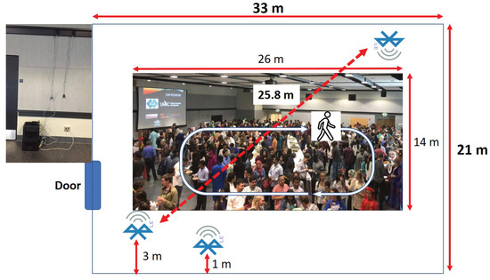 We conducted experiments at a couple of different settings. First, we experimented during one of the largest events at UMKC called “Culture Night”, where around 1300 people from different countries are presenting their cultures in a conference hall. The goal of this experiment was to study how significantly interference and crowd density could affect ICE-MoCha. As the conducted experiments were mainly for the feasibility analysis, we wanted to see if the BLE signal from a BLE transmitter tag can indicate any crowd status. For the purpose, only one BLE transmitter within the crowd was carrying a smart-phone with an application that advertises its BLE signal. Also, to explore multiple scenarios during the event to establish a better understanding of crowd status. As illustrated in Figure 12, a conference hall size was about 700 m2 (33 m * 21 m), and people area was about 370 m2 (26 m * 14 m). We posted a couple of BLE scanners on an opposite side placed at the height of 3 m. The distance between the two BLE scanners was about 25 m. We also put another BLE scanner placed at the height of 1 m next to the door. A moving human object walked around the hall in a circle.