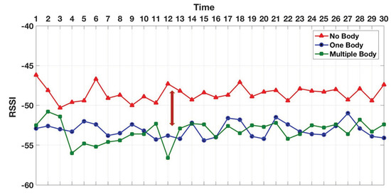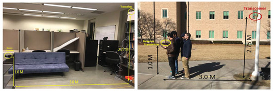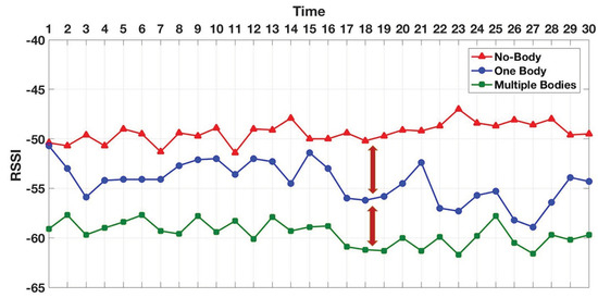 Second, we conducted RSSI experiments both indoors and outdoors. As shown in Figure 13, we placed a BLE transceiver at 2.75 m height and a BLE transmitter at 1 m height in 3 m apart. We put human interference from none to three or four people near the BLE transmitter. We set up the transceiver to scan for a minute each test, with a total of ten separate times for each test session.