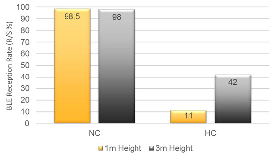 Figure 15 presents the results of the BLE reception rate (i.e., received (R) percentage of sent (S) beacons) for the different heights in both NC and HC environments. We setup the BLE transceiver heights for one meter (low) and three meters (high), respectively. In general, it shows that the higher crowd (HC) there were, the higher number of beacon messages were dropped. The result shows that the message-receiving ratio in HC environment was about 50% less than that in NC environment. Furthermore, the reception rate of the higher BLE detector (three meters) was about 31% higher than that of the lower BLE detector (one meter). In this result, we can see that the efficient BLE detector location (in height) is above every human height to avoid any signal absorption by the crowds.