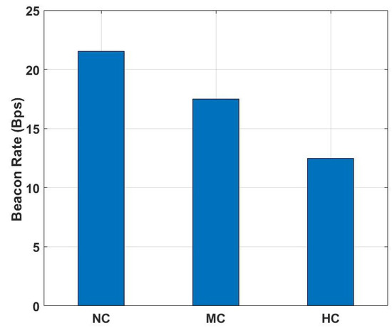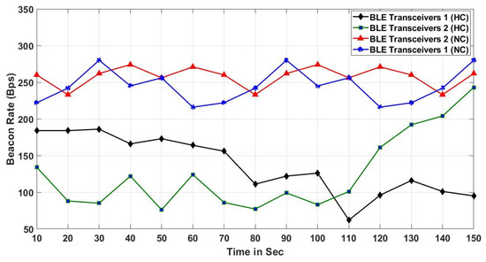 Figure 16 shows the average received beacons per second (Bps). For the experiment, we configured the BLE transmitter’s beacon advertising interval to 20 ms. Adding a random delay of 0–10 ms and a scan interval of 10 ms, a BLE scanner can get a beacon about every 40 ms, which means it received around 24–25 Bps. The results show that in the NC environment the received beacons are around 23 Bps while in the HC environment it decreased to 13 Bps. The results indicate that human object certainly had an impact on the received beacon count. The effect is proportional to the size of the crowd.