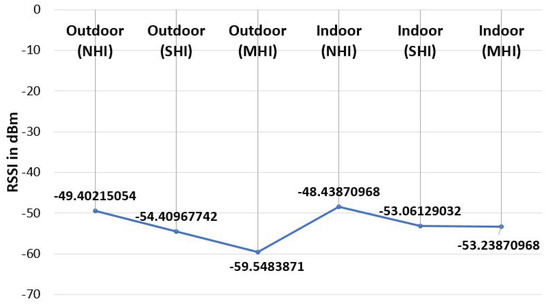 In addition to beacon counting, we further measured a couple of BLE RSSI metrics including the RSSI power and variation. In both indoor and outdoor environments, we tested under three workload conditions including NHI, SHI, and MHI. The indoor test results in Figure 18 show that the average RSSI power in NHI was stronger than both SHI and MHI, while there was no significant difference in the signal power average between the SHI and MHI. On the other hand, the outdoor average RSSI power results in Figure 19 show that NHI received stronger signal RSSI power than SHI, and SHI had stronger signal RSSI power than MHI. As shown in Figure 20, the total indoor RSSI power of both SHI and MHI is the same, while the total outdoor shows each NHI, SHI, and MHI RSSI powers show a clear difference.