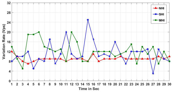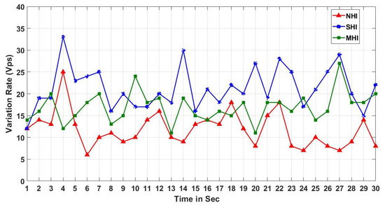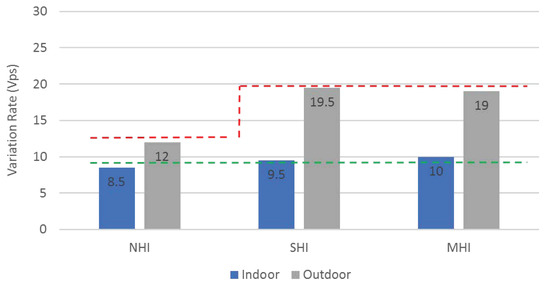 We test a variation of the received RSSI power. We picked the maximum, and minimum RSSI power values among the beacons received in a second (Vps), and used the difference as a variation value. The indoor RSSI variation test results in Figure 21 show that the RSSI variation in NHI is stable while the RSSI variation in other non-NHI (i.e., SHI and MHI) is randomly fluctuating. On the other hand, the outdoor RSSI variation test results in Figure 22 show that the RSSI variation results in all workloads (NHI, SHI, and MHI) unstably vibrating. As shown in Figure 23, the average indoor RSSI variation values are stable in all workloads from 8.5 to 10 Vps. Although the average values were similar, the variation values in both SHI and MHI are fluctuated while NHI variation was stable. Meanwhile, the average outdoor RSSI variation values were much higher than the indoor variation average values and are also different between NHI and non-NHI. The non-NHI values were similar and higher than the NHI value. In summary, the indoor results indicate that they can identify any human interference (i.e., NHI vs. non-NHI). However, the outdoor case cannot discern any density. Hence, it indicates that the RSSI variation metric alone can identify a coarse level of indoor human interference. For example, it can be used to check if there is a person in the room or not, but it not possible to notice the crowd density.