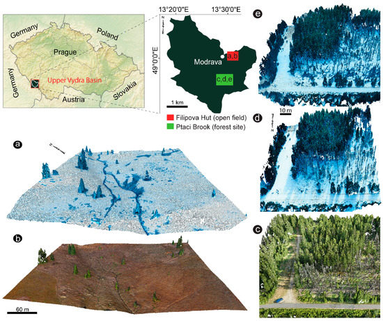 An overview map of the study area (a). Location of the regions surveyed with the generated 3D point cloud models. These point clouds assist in providing visual information on the snow surface and terrain type. The red box shows the open area (Filipova Hut) during snow ablation (a) and snow-free period (b), the green box displays the disturbed spruce forest zone (Ptaci Brook) during snow-free period (c) snow-covered (e.g., peak accumulation) (d), and snow ablation period (e)).