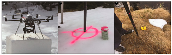 (a) Applied ARF MicroKopter Okto XL equipped with RGB Lumix-GX7 camera (Panasonic Corporation, Osaka, Japan); (b) Marked ground control points (GCPs) and checkpoints (CPs) with visible pink spray during all winter campaigns; (c) Yellow geodetic pits and white papers served as GCPs during the snow-free campaigns.