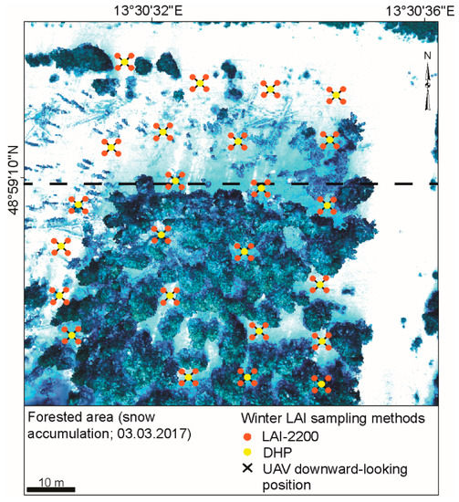 LAI measurements (Figure 3) were performed respectively at the 3 and 24 March 2017. To test the reliability of the UAV-based LAI flyovers, additional ground-based measurements using the Li-Cor LAI-2200 plant canopy analyzer (Li-COR Inc., Lincoln, USA) [57] and DHP, were conducted. During the first campaign, a little snow was still present at a few tree crowns. Additionally, dead lying wood on the ground was already snow-free. These optical methods are for indirect field measurements of LAI, producing the so-called effective LAI index (LAIeff; [58]). The optical detector of the LAI-2200 sensor is composed of five different detectors in concentric rings, each of which views a portion of the hemisphere, such as 0–13° (1st ring), 16–28° (2nd ring), 32–43° (3rd ring) and 61–74° (4th ring) [59]. This allows for the computation of radiation transmission caused by the canopy in the blue part of the spectrum and therefore calculates the LAI by comparing differential light measurements above and below the canopy [60]. Above measures served as a reference and were taken before each set of below-canopy sampling outside the forest. Below-canopy measurements with the LAI-2200 were made about 1 m above the ground in a grid of 50 × 50 m, at 10 m intervals, for 24 points at the forest site.