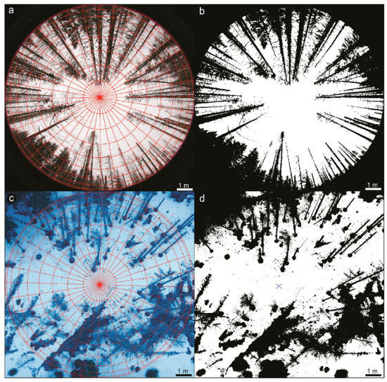 The UAV surveys for LAI retrieval were performed in partly sunny to overcast conditions. Overcast conditions are more preferable to avoid shadows on the forest floor [60], which can hamper exact LAI retrieval, but images could be analyzed with adequate accuracy. The UAV-based LAIeff values were estimated from measurements that were taken at two different altitudes (at ~50 m and ~65 m) to determine whether there were observed differences in the LAIeff retrieval between the optimal height and higher ones. The downward-looking UAV images were taken from nadir position with a field of view (FOV) of 48°. To catch approximately the same positions of ground measurements, images were obtained at an interval of one second. Altogether, 24 points were measured within the Norway spruce stand and marked by a blue cross sprayed on the snow-cover, like those recorded by the other two optical methods. All LAI values measured in this study are effective values, so the clumping of the needles was not taken into account. GLA software, used for LAI assessment by DHP (Figure 4a,b), was also applied for LAI determination, based on UAV downward-looking images (Figure 4c,d). This allows for the processing of both custom fisheye lens distortions, and also of standard lens projections [64,65]. Here, instead of a polar projection, which is used for fisheye lenses, an orthographic standard projection for rectangle images was used in GLA software. GLA computes all zenith angles from 0 to 60° for its effective LAI. The manual segmentation based on classifying pixels as either canopy or snow. The environment of the GLA is shown in Figure 3, and the input parameters are listed in Table 2.