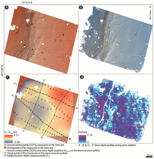 (a,b) Hillshaded snow-free and snow-covered DSMs and detail surface visualization of the open site (Filipova Hut) with the applied ground control points (GCPs) and checkpoints (CPs). GCPs taken during snow cover served as well as reference snow depth points at the GCP positions (HGCP; pink crosses). Overlapping snow-free and snow-covered GCPs were selected in support of co-georeferencing the snow-free DSM with the snow-covered DSM. (c) Map of interpolated spatial distribution of the snow height differences between the supplementary HT probes and estimated HUAV measurements underlying the bare soil hillshade (d) DSM of difference (DoD), produced by subtracting the snow-covered DSM from the snow-free DSM.