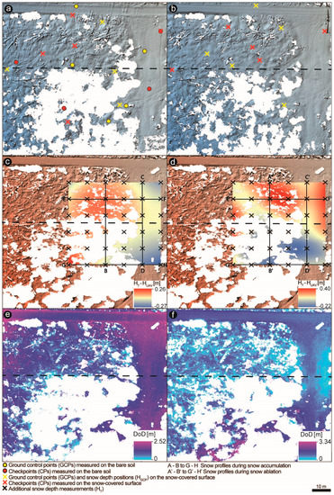 (a,b) Hillshaded snow-covered DSMs during snow accumulation and ablation, and detail surface visualization of the forest site (Ptaci Brook) with the applied ground control points (GCPs) and checkpoints (CPs). GCPs taken during snow cover served as well as reference snow depth points at the GCP positions (HGCP; pink crosses). Overlapping snow-off and snow-on GCPs were selected in support of co-georeferencing the snow-free DSM with the snow-covered DSMs. (c,d) Maps of the interpolated spatial distribution of the snow height differences between the supplementary HT probes and estimated HUAV measurements underlying the bare soil hillshade. (e,f) DSMs of difference (DoDs).